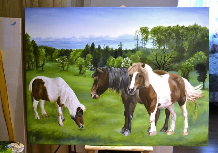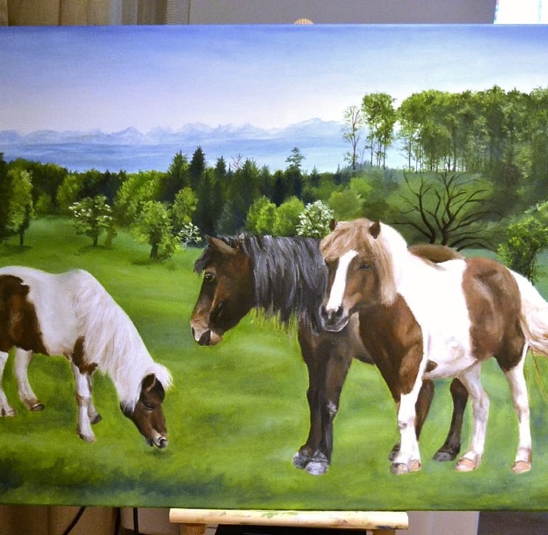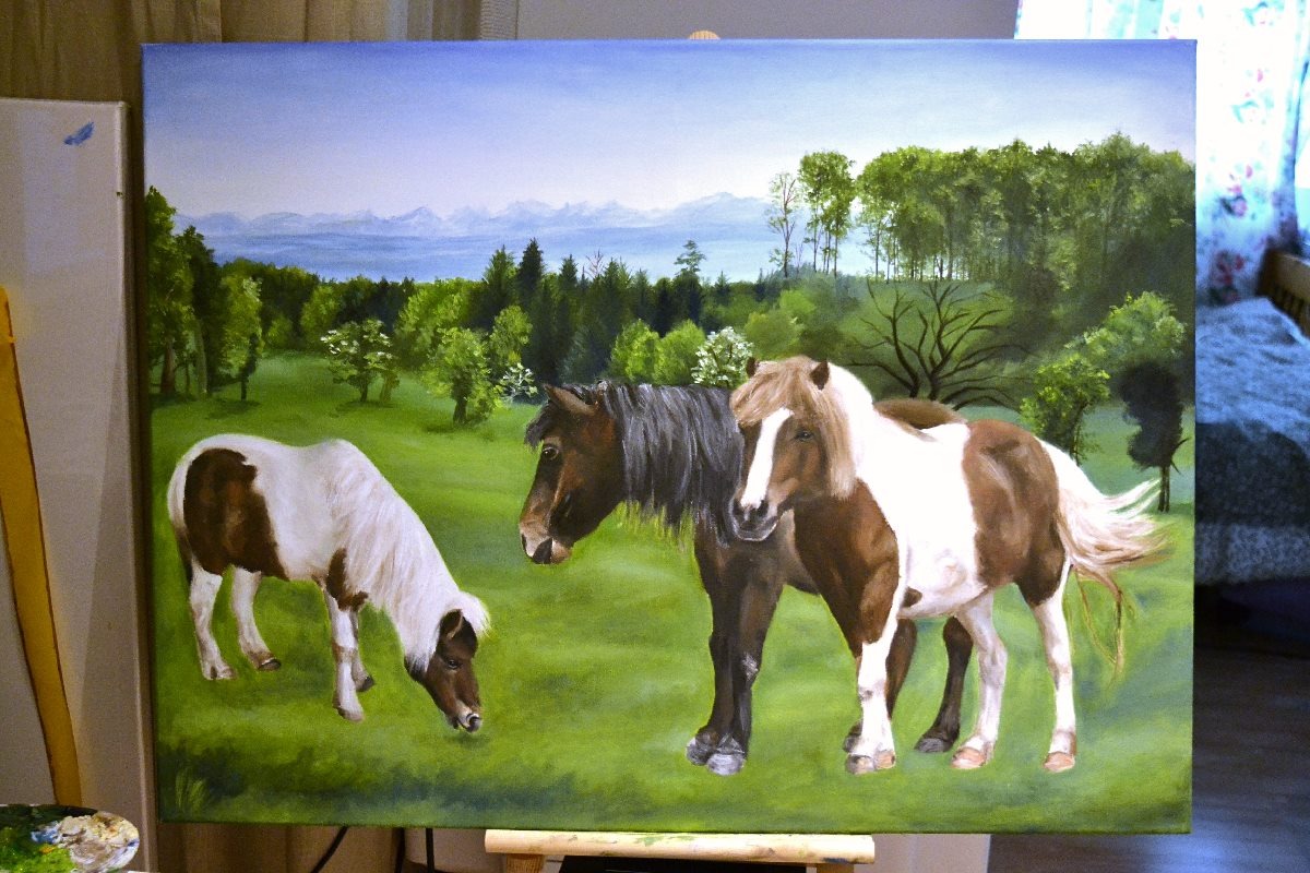 Unsere Mutter meinte, es wäre schön, das zu malen, also haben wir zuerst die Ponys digital auf das Landschaftsfoto geklebt, und dann hat meine Schwester Elisha angefangen, die Ponys zu malen.